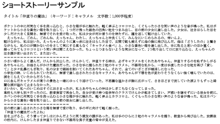 Webライティング実務士の有資格者(実務経験10年)が、ご提示頂いたキーワードからイメージを膨らませ、ショートストーリーを作成いたします。